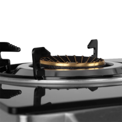 Corpo Inox Superfíce de vidro temperado negro Acendimento piezoelétrico Combustível: Gás butano e gás propano Tipo de gás G-30: Pressão 28-30 mbar Tipo de gás G-31: Pressão 37mbar Categoria I3+ Base antiderrapante 2 queimadores de tripla coroa Sistema de seggurança FFD (Flame Fail Device): anula a saída de gás no caso da chama se apagar involuntáriamente Fácil de limpar Queimador pequeno: 3,4kW Queimador grande: 4,3kW Consumo total de gás: 560.31 g/h Dimensões: 71x13x41cm Para uso interno e externo