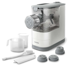 Acessórios: Ferramenta de limpeza; Copo medidor; Folheto de receitas Número de discos para modelar: 4 Laváveis na máquina de lavar a loiça Bloqueio de segurança Comprimento do cabo de alimentação: 1 m Frequência: 50 Hz Potência: 150 W Voltagem: 220 - 240 V Dimensões do produto (CxLxA): 350 x 135 x 287 mm Peso do produto: 4,7 kg Cor: Branco Cor do painel de controlo: Dusk Vapor Material dos acessórios: Plástico Material da estrutura principal: Plástico