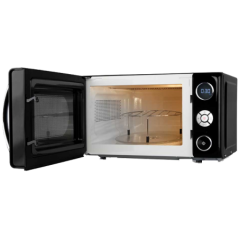 Potência micro ondas: 700W Potência grill: 900W Capacidade: 20lts 10 níveis de potência do micro ondas Grill com elementos de aquecimento de Quartzo Display de controlo LED Temporizador digital de 95 min Bloqueio de segurança automático para crianças 8 menus pré-configurados Início rápido Cozedura multifunções: podem ser definidos 3 programas diferentes para uma única sequência Descongelação de acordo com o peso 2 funções combinadas Sinal acústico de fim de cozinhado Detalhes cromados no painel de controlo e na pega Prato giratório com um diâmetro de 24,5cm